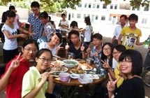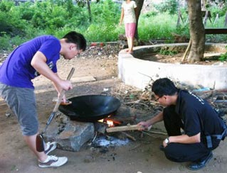 在三教村,志愿者受到了當(dāng)年解放軍進(jìn)城的待遇。由于小學(xué)在施工不便住宿,村民便打開自家新裝修的房子請隊(duì)員們住。接著隊(duì)員們到露天廚房大展身手,灶臺是由幾個(gè)石頭和一個(gè)大鐵鍋搭建而成。指導(dǎo)老師看大家興致高,也過來起火,燒柴。有天傍晚,烏云密布,眼瞅著雨就要掉下來,為了能讓志愿者們下雨前吃到飯,熱心的村民為志愿者們買醬料,給他們燒起了飯。