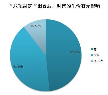 截至2013年12月20日10時(shí),共收到網(wǎng)絡(luò)問(wèn)卷2442份,48.4%的受訪者認(rèn)為“八項(xiàng)規(guī)定”對(duì)個(gè)人生活有影響,其中公務(wù)員群體認(rèn)為“八項(xiàng)規(guī)定”帶來(lái)的最大影響是“公務(wù)吃請(qǐng)少了,能抽出更多時(shí)間陪伴家人”和“津貼補(bǔ)貼獎(jiǎng)金少了,勒緊褲帶過(guò)日子”,非公務(wù)員群體認(rèn)為“八項(xiàng)規(guī)定”帶來(lái)的最大影響是“酒店、高端會(huì)所門外的公務(wù)用車少了”和“遇到領(lǐng)導(dǎo)考察工作時(shí),地毯鮮花迎送領(lǐng)導(dǎo)的情況少了”。