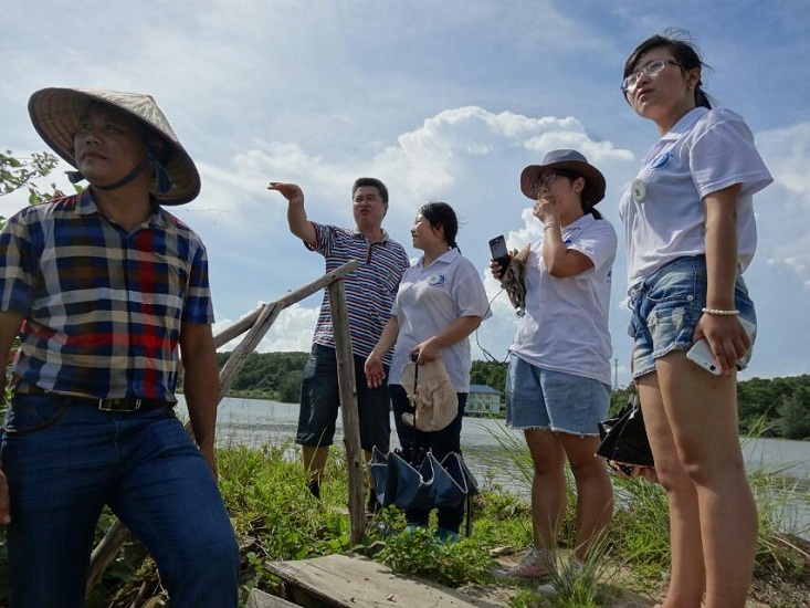 同一時間,團(tuán)隊的女生頂著毒辣的日頭趕到防城港,與廣西紅樹林研究中心珍珠灣野外工作站的鐘云旭站長、羅硯科長共同參觀生態(tài)養(yǎng)殖基地,了解基地目前的養(yǎng)殖及收獲狀況。目前該基地在魚類養(yǎng)殖中已取得部分成效,并已實(shí)現(xiàn)了半生態(tài)的養(yǎng)殖。