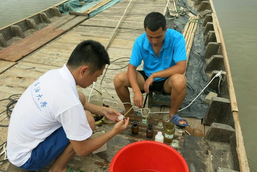7月10日,團隊聯(lián)合廣西海洋研究所紅樹林研究中心對欽江東西支流進行水樣調(diào)查,這是此次活動中的重要工作。6名男生在船上和工作人員一同工作了26個小時,協(xié)助工作人員進行水樣采集與固定,流速與流向測定,水深測定及GPS定位等,從中也學(xué)到了很多海洋知識。
