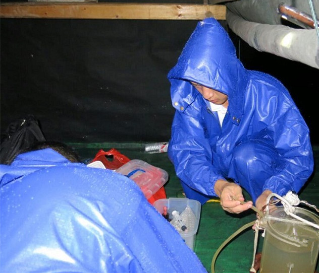 7月10日夜晚,隊員們冒著大雨進行水樣分析