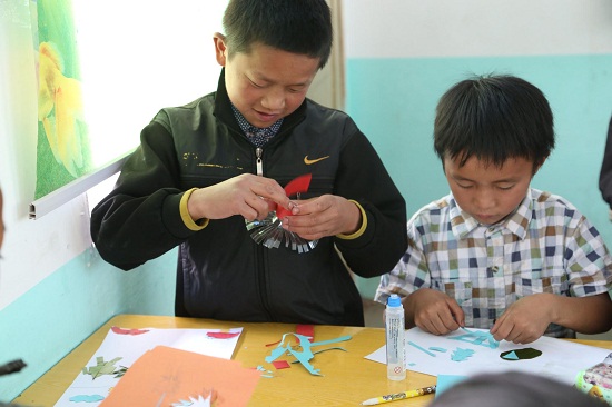 在海雀村的活動中,兩個小朋友在志愿者的幫助下認(rèn)真的完成手工制作。