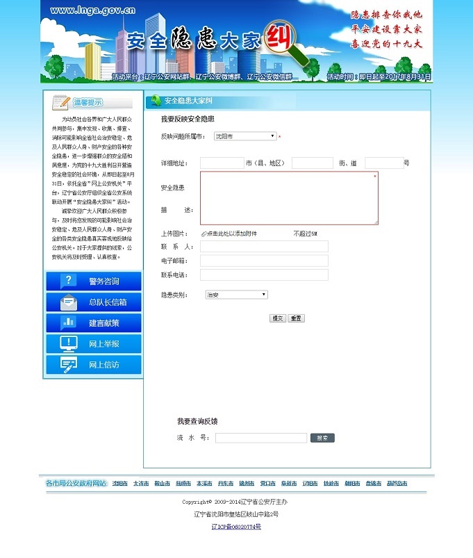 1、直接登錄遼寧省公安廳門(mén)戶網(wǎng)站開(kāi)設(shè)的“安全隱患大家糾”活動(dòng)專(zhuān)欄(http://www.lnga.gov.cn/ztzl/aqyhdjj/ ),按欄目提示錄入您發(fā)現(xiàn)的安全隱患線索;