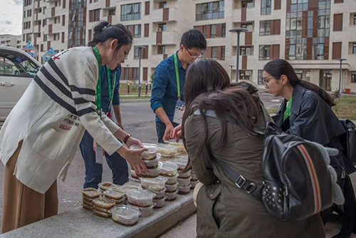聽了介紹,更加渴望見到我們的大廚啦。劉芳總監(jiān)為我們提供了一個(gè)便利,讓我們趁大廚送飯的時(shí)候近距離接觸大廚。隨后我們來到世博村內(nèi)的送餐地點(diǎn),有幸看到兩位大廚正在給志愿者們分發(fā)盒飯。