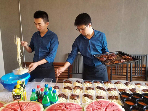 趁著兩位大廚張羅著分發(fā)盒飯的功夫,小編趕緊跟大廚交流起來。這兩位大廚分別是劉會(huì)彬和高德發(fā),都是名副其實(shí)的“90后”,別看年輕,兩位大廚的廚藝精湛,參與保障過青島國際啤酒節(jié)、國際象棋大賽等國際節(jié)慶活動(dòng)及賽事。