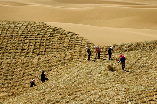 工人在扎麥草方格