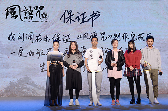 發(fā)布會(huì)現(xiàn)場,導(dǎo)演劉闊收到了來自粉絲扛來的“刀片”,簽下“按時(shí)更新保證書”。出品人陶虹自曝自己是“畫江湖”系列的忠實(shí)粉絲,此次參與滿足了作為一個(gè)粉絲的“私心”。現(xiàn)場,她和知名配音演員邊江、山新演繹了《風(fēng)語咒》人物經(jīng)典之聲,嗨爆全場。