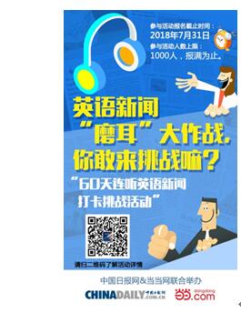 2018這個夏天,中國日報(bào)網(wǎng)攜手當(dāng)當(dāng)網(wǎng)推出首期“60天連聽英語新聞打卡達(dá)人活動”,你不僅能通過中國日報(bào)網(wǎng)外籍專家的純正英音、美音了解每天世界上的精彩趣聞,還可以考驗(yàn)自己的毅力和自律性。60個工作日,三個月的時(shí)間,看似很短,但是你的努力,時(shí)間看得到!跟上我們這60天的步伐,相信您的英語能力會日益精進(jìn)。