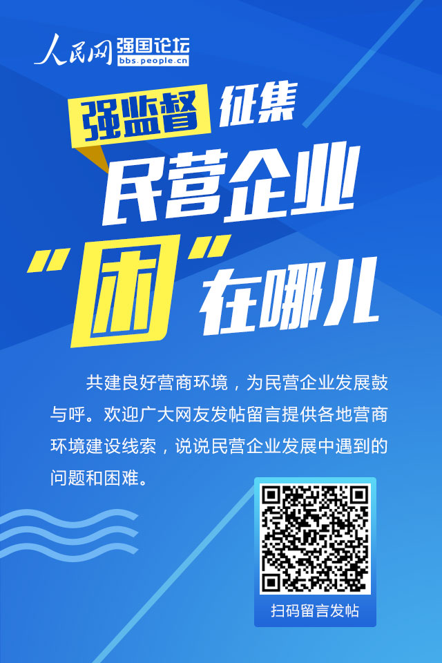 共建良好營商環(huán)境,為民營企業(yè)發(fā)展鼓與呼,人民網(wǎng)強國論壇開設“專項監(jiān)督”版塊,歡迎廣大網(wǎng)友發(fā)帖留言提供各地營商環(huán)境建設線索,說說民營企業(yè)發(fā)展中遇到的問題和困難,以期共同推動“糾正一些政府部門、大企業(yè)利用優(yōu)勢地位以大欺小、拖欠民營企業(yè)款項的行為”,為民營經(jīng)濟發(fā)展創(chuàng)造健康環(huán)境。
