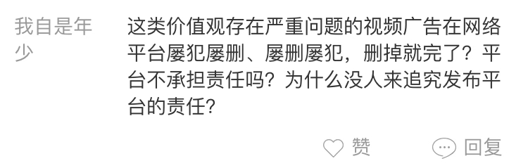網(wǎng)友“我自是年少”:這類價(jià)值觀存在嚴(yán)重問(wèn)題的視頻廣告在網(wǎng)絡(luò)平臺(tái)屢犯屢刪、屢刪屢犯,刪掉就完了?平臺(tái)不承擔(dān)責(zé)任嗎?