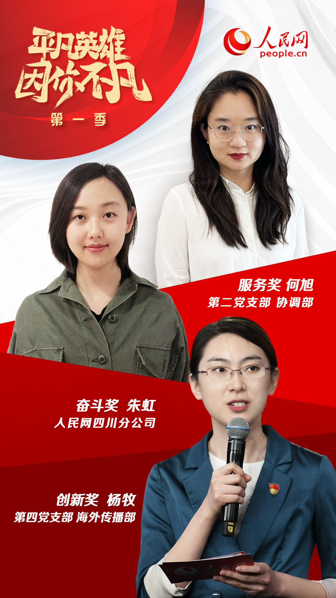 經(jīng)過激烈比拼,第二黨支部何旭(協(xié)調(diào)部)、第四黨支部楊牧(海外傳播部)、四川分公司朱虹三位同志最終分獲“平凡英雄”服務(wù)獎、創(chuàng)新獎和奮斗獎。同時,第七黨支部董曉偉(網(wǎng)絡(luò)評論部)、第十一黨支部厲姣(紀檢監(jiān)察室)、第十三黨支部鄭瀟瀟(移動內(nèi)容部)、第二十一黨支部張利娟(人民視聽科技有限公司)、安徽分公司李希、山西分公司馬瑩等六位同志獲得“平凡英雄”入圍獎。