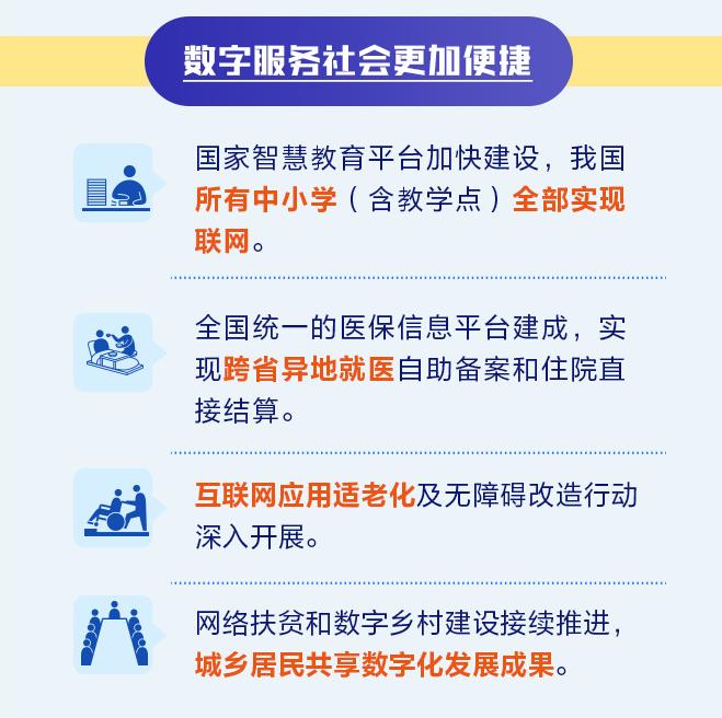 與此同時,《報告》介紹,在數(shù)字服務(wù)社會方面,國家智慧教育平臺加快建設(shè),我國所有中小學(xué)(含教學(xué)點(diǎn))全部實(shí)現(xiàn)聯(lián)網(wǎng)。全國統(tǒng)一的醫(yī)保信息平臺建成,實(shí)現(xiàn)跨省異地就醫(yī)自助備案和住院直接結(jié)算;ヂ(lián)網(wǎng)應(yīng)用適老化及無障礙改造行動深入開展。網(wǎng)絡(luò)扶貧和數(shù)字鄉(xiāng)村建設(shè)接續(xù)推進(jìn),城鄉(xiāng)居民共享數(shù)字化發(fā)展成果。