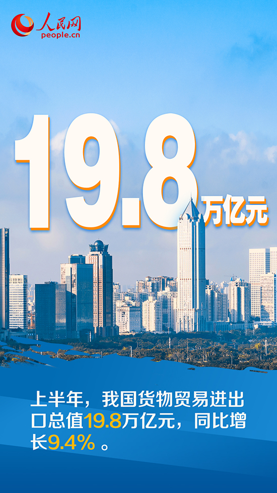 據(jù)海關統(tǒng)計,今年上半年我國貨物貿(mào)易進出口總值19.8萬億元,同比增長9.4%。其中,出口11.14萬億元,增長13.2%;進口8.66萬億元,增長4.8%……上半年外貿(mào)進出口“答卷”傳遞出我國經(jīng)濟持續(xù)恢復的積極信號。