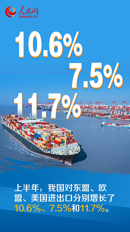 上半年,我國對東盟、歐盟、美國進出口分別增長了10.6%、7.5%和11.7%。同期,我國對“一帶一路”沿線國家、區(qū)域全面經(jīng)濟伙伴關系協(xié)定(RCEP)貿(mào)易伙伴進出口分別增長17.8%和5.6%。